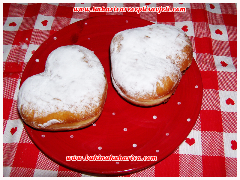Nađe se tu i posebnih oblika krafni, krafne – srca najčešće. Zatim ih obilno posipa mirišljavim vanili štaub šećerom.